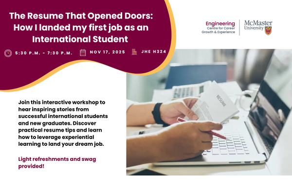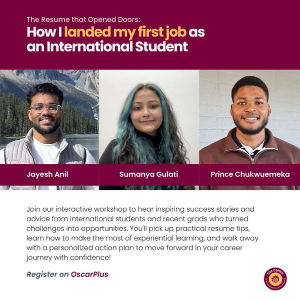 If you have answered 'Yes' to any of these questions, join our interactive workshop to hear inspiring success stories and advice from international students and recent grads who turned challenges into opportunities. You'll pick up practical resume tips, learn how to make the most of experiential learning, and walk away with a personalized action plan to move forward in your career journey with confidence!